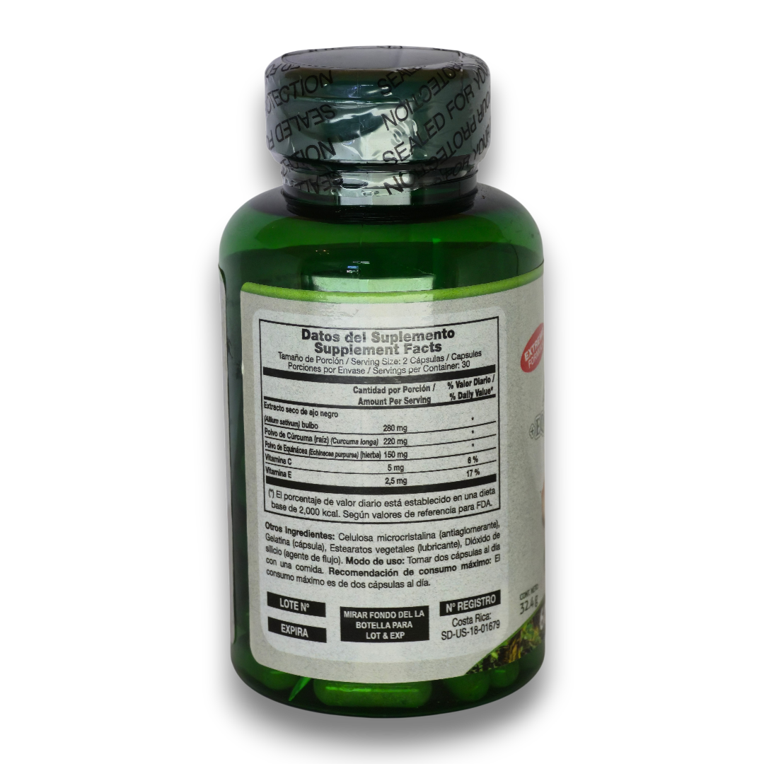 • Refuerzo Inmunitario: La combinación de equinácea y ajo negro ayuda a elevar las defensas naturales para prevenir infecciones comunes.