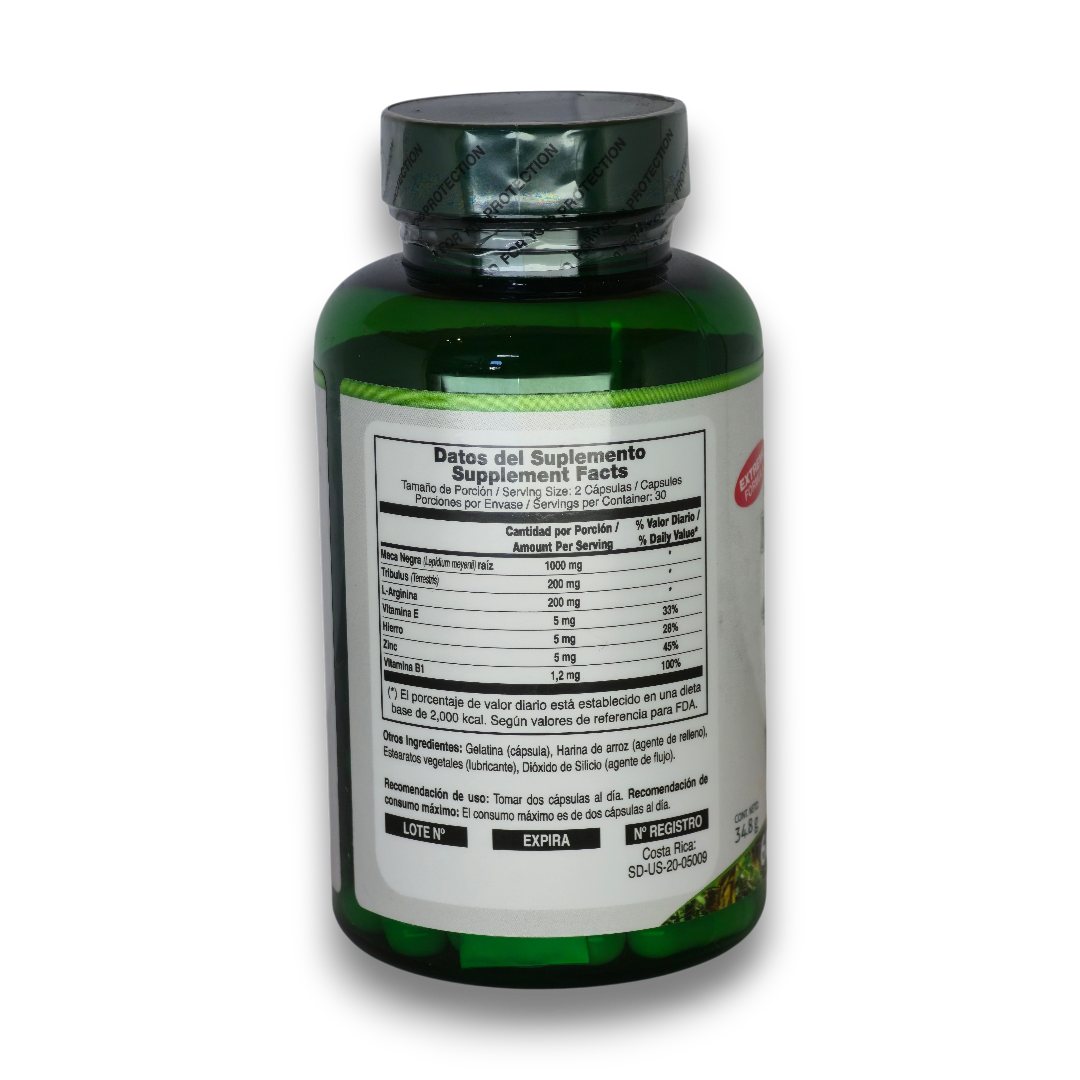 Este suplemento de potencia extrema tiene como propósito principal revitalizar el desempeño físico y mental, actuando como un vigorizante natural tanto para hombres como para mujeres. Su fórmula avanzada logra una sinergia superior al combinar la Maca Negra con Tribulus terrestris y L-Arginina, ingredientes que trabajan en conjunto con un complejo de Vitamina B1, E, Hierro y Zinc para optimizar los niveles de energía y la respuesta metabólica. Al ser ingerido en cápsulas de fácil absorción, el consumidor experimenta un aumento en su vitalidad diaria, una mejora en la resistencia física y un apoyo significativo en el equilibrio de las funciones vitales del organismo.