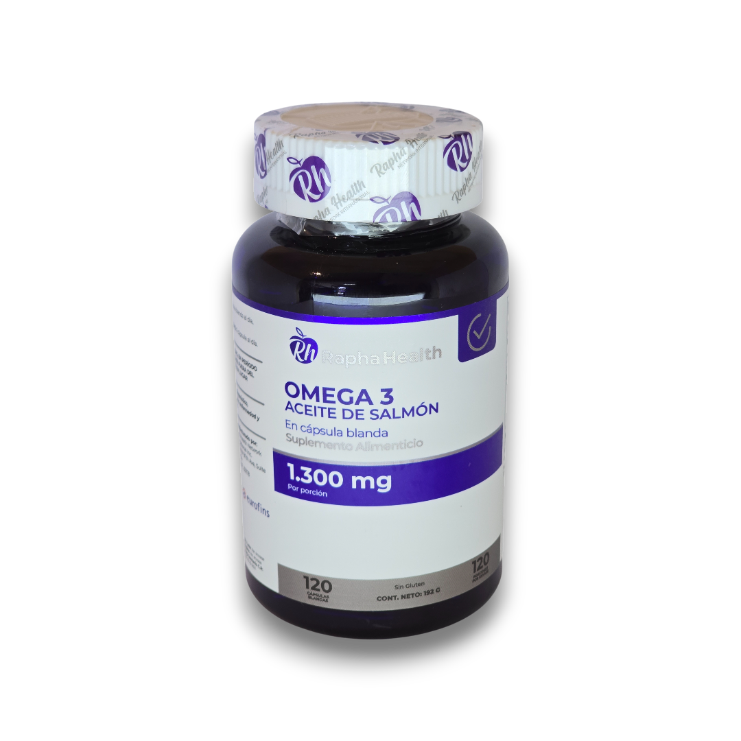 Este suplemento de Rapha Health proporciona una fuente pura y concentrada de ácidos grasos esenciales derivados del salmón. El frasco contiene 120 cápsulas blandas (softgels). Cada cápsula aporta 1,300 mg de aceite de pescado, entregando niveles clave de EPA (234 mg) y DHA (156 mg), además de estar enriquecido con Vitamina E para preservar la frescura del aceite y evitar su oxidación.
